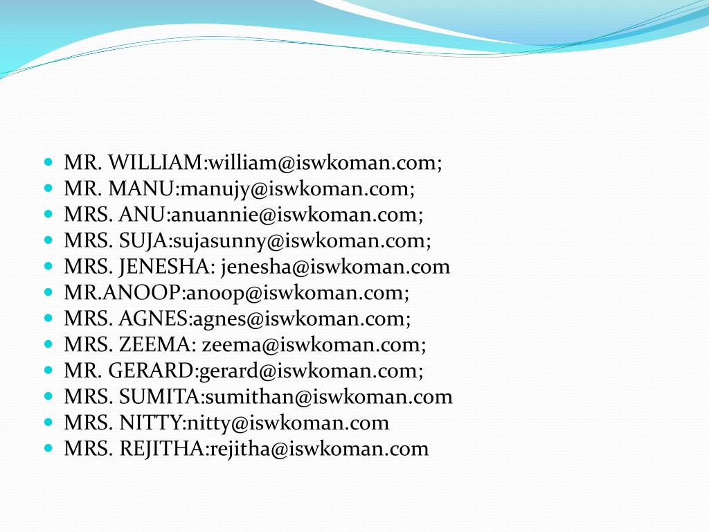 MR. WILLIAM:william@iswkoman.com; • MR. MANU:manujy@iswkoman.com; • MRS. ANU:anuannie@iswkoman.com; • MRS. SUJA:sujasunny@iswkoman.com; • MRS. JENESHA: jenesha@iswkoman.com • MR.ANOOP:anoop@iswkoman.com; • MRS. AGNES:agnes@iswkoman.com; • MRS. ZEEMA: zeema@iswkoman.com; • MR. GERARD:gerard@iswkoman.com; • MRS. SUMITA:sumithan@iswkoman.com • MRS. NITTY:nitty@iswkoman.com • MRS. REJITHA:rejitha@iswkoman.com