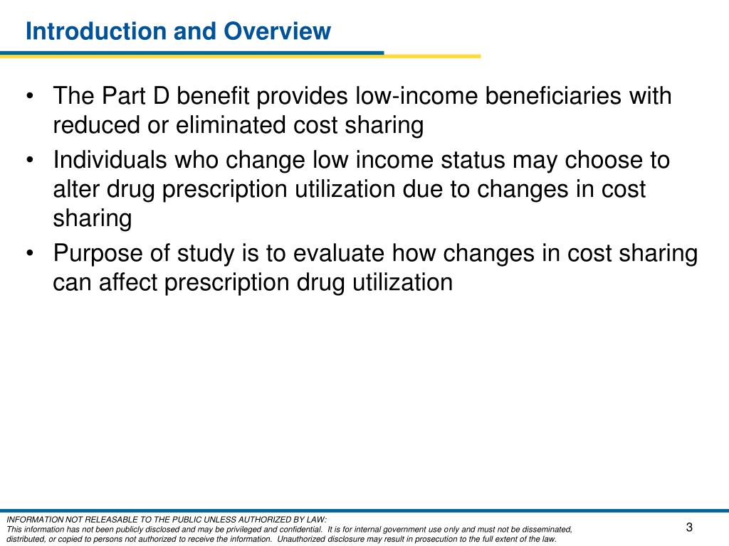 Introduction and Overview • The Part D benefit provides low-income beneficiaries with reduced or eliminated cost sharing • Individuals who change low income status may choose to alter drug prescription utilization due to changes in cost sharing • Purpose of study is to evaluate how changes in cost sharing can affect prescription drug utilization