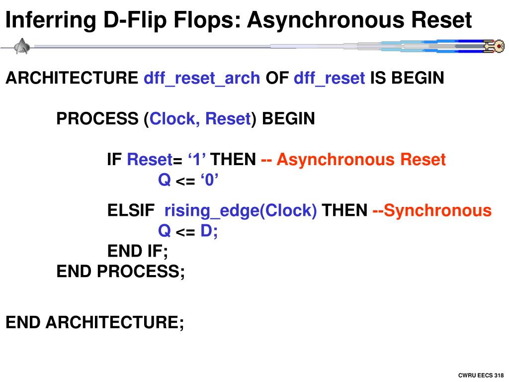 Inferring D-Flip Flops: Asynchronous Reset ARCHITECTURE dff_reset_arch OF dff_reset IS BEGINPROCESS (Clock, Reset)BEGIN IF Reset= ‘1’ THEN -- Asynchronous ResetQ <= ‘0’ ELSIF rising_edge(Clock) THEN--Synchronous Q <= D; END IF; END PROCESS; END ARCHITECTURE; CWRU EECS 318