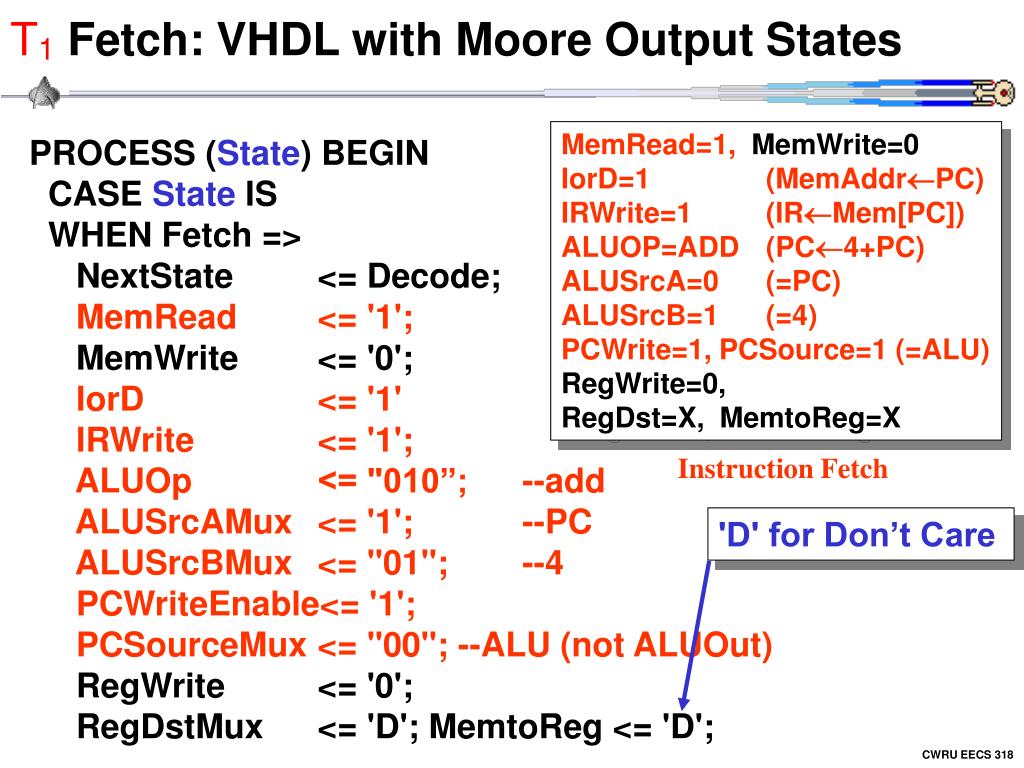 T1 Fetch: VHDL with Moore Output States 'D' for Don’t Care MemRead=1, MemWrite=0IorD=1 (MemAddrPC)IRWrite=1 (IRMem[PC])ALUOP=ADD (PC4+PC)ALUSrcA=0 (=PC)ALUSrcB=1 (=4)PCWrite=1, PCSource=1 (=ALU)RegWrite=0, RegDst=X, MemtoReg=X PROCESS (State) BEGIN CASE State IS WHEN Fetch => NextState <= Decode; MemRead <= '1';MemWrite <= '0'; IorD <= '1' IRWrite <= '1'; ALUOp <= "010”; --add ALUSrcAMux <= '1'; --PC ALUSrcBMux <= "01"; --4 PCWriteEnable<= '1'; PCSourceMux <= "00"; --ALU (not ALUOut) RegWrite <= '0'; RegDstMux <= 'D'; MemtoReg <= 'D'; Instruction Fetch CWRU EECS 318