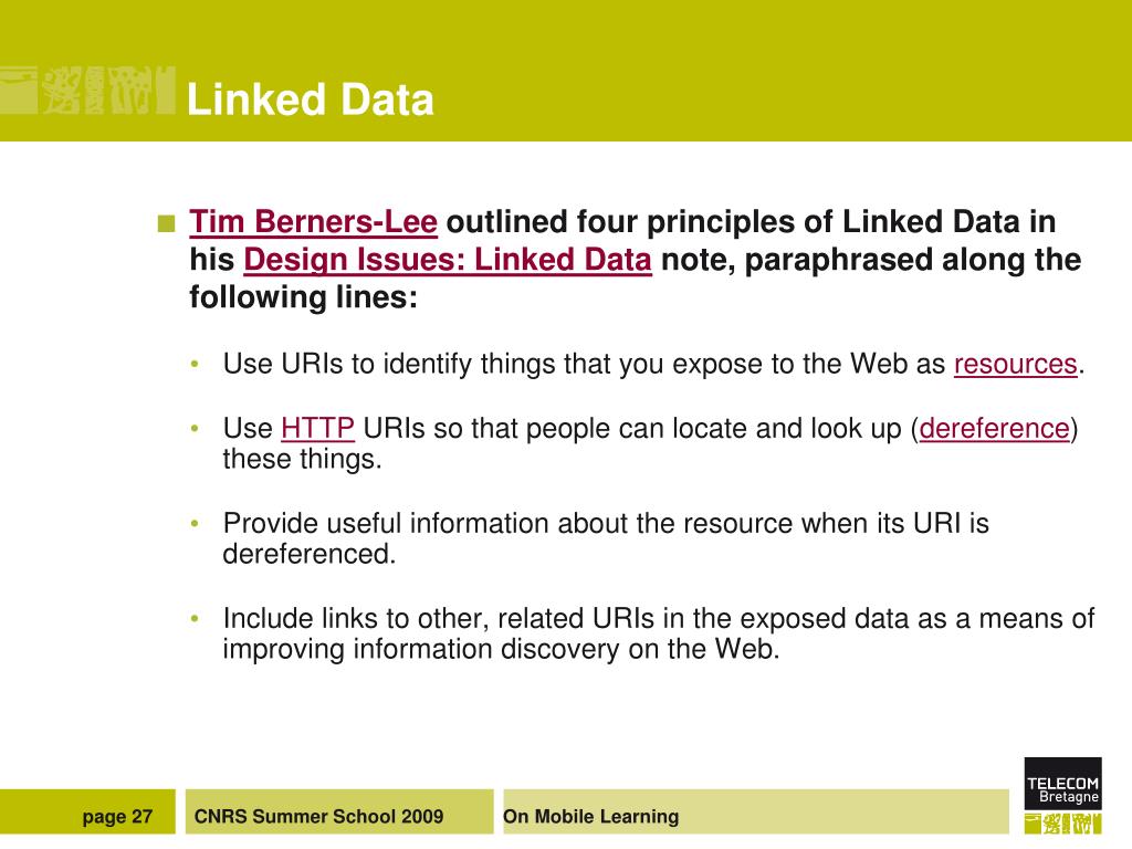 Linked Data • Tim Berners-Lee outlined four principles of Linked Data in his Design Issues: Linked Data note, paraphrased along the following lines: • Use URIs to identify things that you expose to the Web as resources. • Use HTTP URIs so that people can locate and look up (dereference) these things. • Provide useful information about the resource when its URI is dereferenced. • Include links to other, related URIs in the exposed data as a means of improving information discovery on the Web. On Mobile Learning
