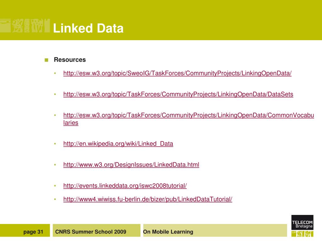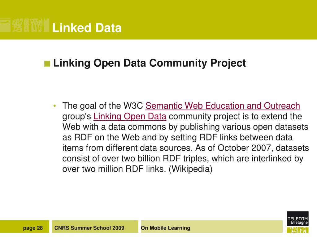 Linked Data • Linking Open Data Community Project • The goal of the W3C Semantic Web Education and Outreach group's Linking Open Data community project is to extend the Web with a data commons by publishing various open datasets as RDF on the Web and by setting RDF links between data items from different data sources. As of October 2007, datasets consist of over two billion RDF triples, which are interlinked by over two million RDF links. (Wikipedia) On Mobile Learning