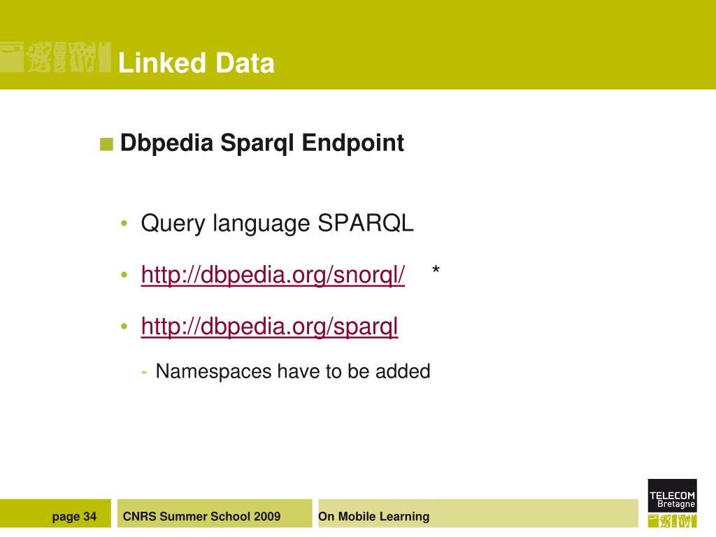 Linked Data • Examples • http://dbpedia.org/page/Amy_Winehouse • http://dbpedia.org/page/Brest%2C_France • http://dbpedia.org/page/%C3%89cole_nationale_sup%C3%A9rieure_des_t%C3%A9l%C3%A9communications_de_Bretagne • http://dbpedia.org/page/Berlin On Mobile Learning