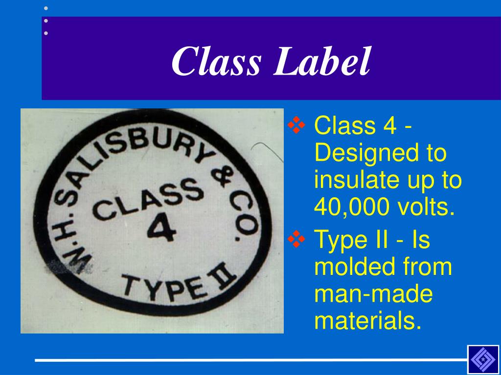 Class Label • Class 4 - Designed to insulate up to 40,000 volts. • Type II - Is molded from man-made materials.