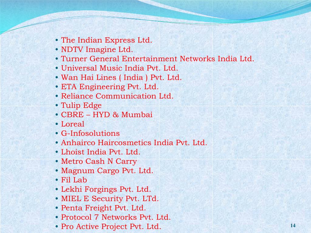 The Indian Express Ltd. • NDTV Imagine Ltd. • Turner General Entertainment Networks India Ltd. • Universal Music India Pvt. Ltd. • Wan Hai Lines ( India ) Pvt. Ltd. • ETA Engineering Pvt. Ltd. • Reliance Communication Ltd. • Tulip Edge • CBRE – HYD & Mumbai • Loreal • G-Infosolutions • Anhairco Haircosmetics India Pvt. Ltd. • Lhoist India Pvt. Ltd. • Metro Cash N Carry • Magnum Cargo Pvt. Ltd. • Fil Lab • Lekhi Forgings Pvt. Ltd. • MIEL E Security Pvt. LTd. • Penta Freight Pvt. Ltd. • Protocol 7 Networks Pvt. Ltd. • Pro Active Project Pvt. Ltd.