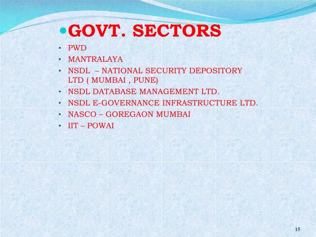 GOVT. SECTORS • PWD • MANTRALAYA • NSDL – NATIONAL SECURITY DEPOSITORY LTD ( MUMBAI , PUNE) • NSDL DATABASE MANAGEMENT LTD. • NSDL E-GOVERNANCE INFRASTRUCTURE LTD. • NASCO – GOREGAON MUMBAI • IIT – POWAI