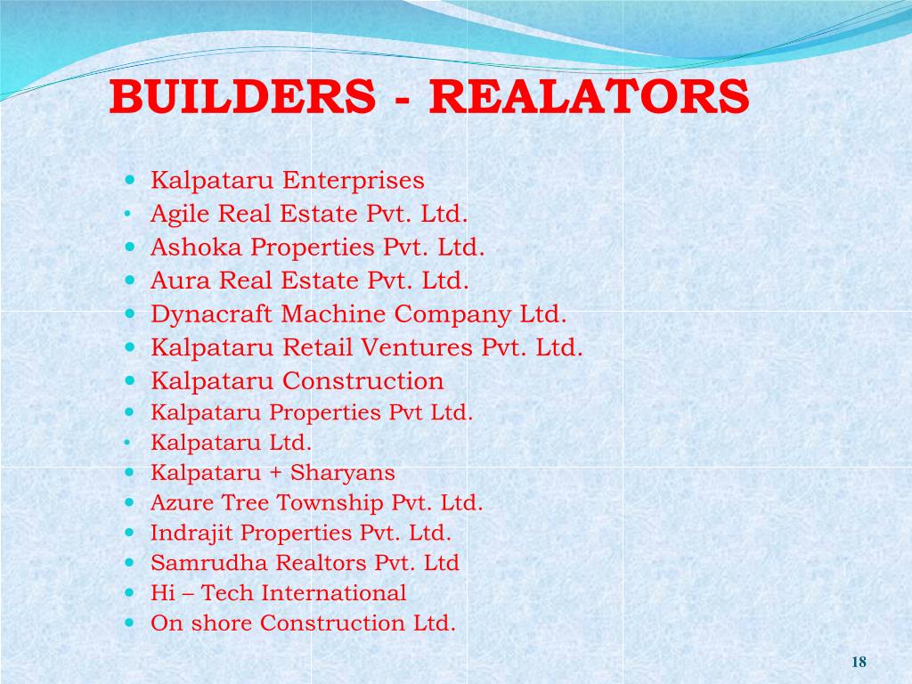 BUILDERS - REALATORS • Kalpataru Enterprises • Agile Real Estate Pvt. Ltd. • Ashoka Properties Pvt. Ltd. • Aura Real Estate Pvt. Ltd. • Dynacraft Machine Company Ltd. • Kalpataru Retail Ventures Pvt. Ltd. • Kalpataru Construction • Kalpataru Properties Pvt Ltd. • Kalpataru Ltd. • Kalpataru + Sharyans • Azure Tree Township Pvt. Ltd. • Indrajit Properties Pvt. Ltd. • Samrudha Realtors Pvt. Ltd • Hi – Tech International • On shore Construction Ltd.