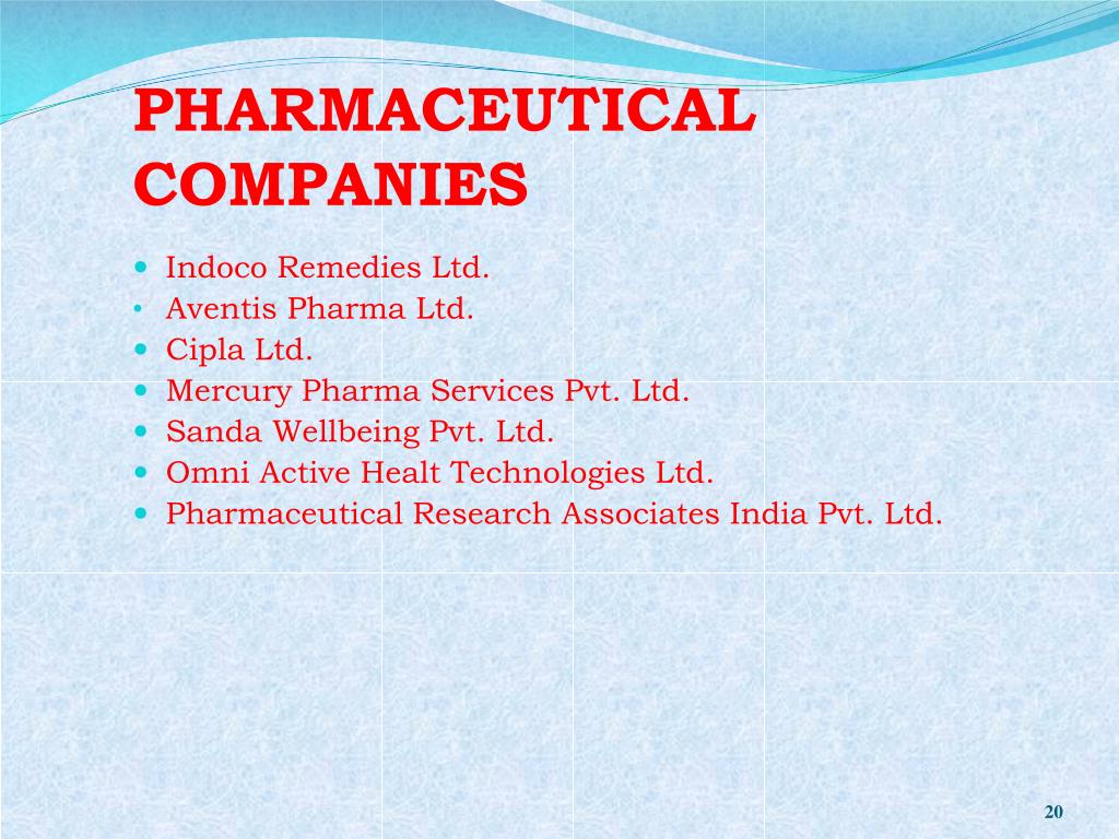 PHARMACEUTICAL COMPANIES • Indoco Remedies Ltd. • Aventis Pharma Ltd. • Cipla Ltd. • Mercury Pharma Services Pvt. Ltd. • Sanda Wellbeing Pvt. Ltd. • Omni Active Healt Technologies Ltd. • Pharmaceutical Research Associates India Pvt. Ltd.