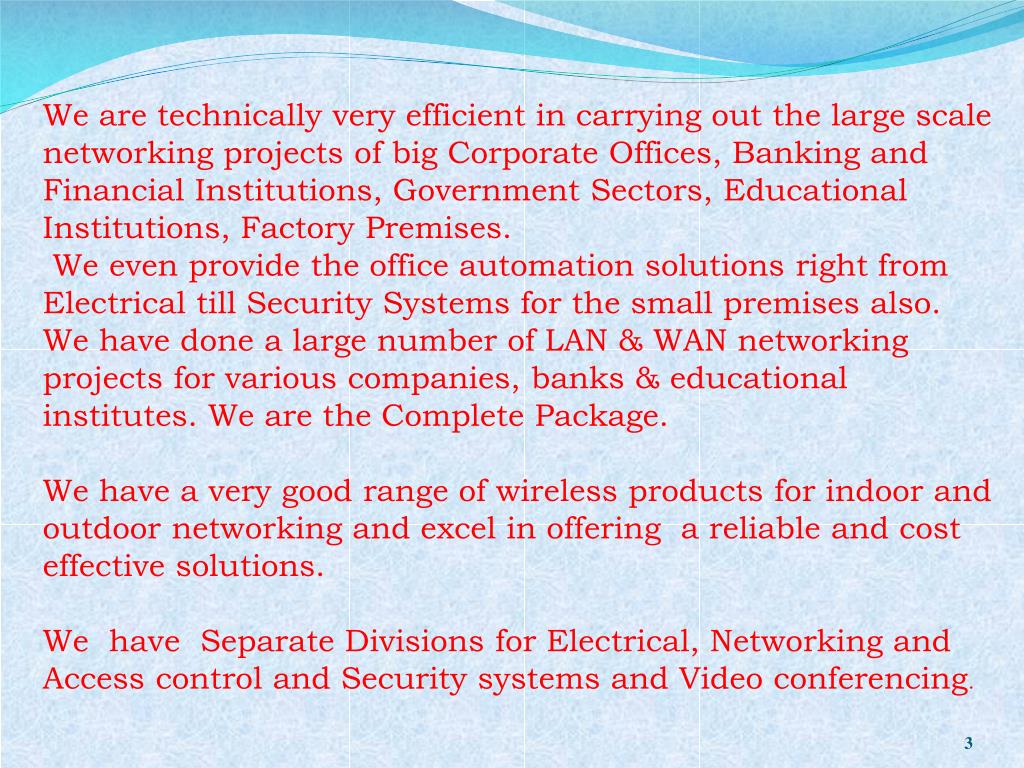 We are technically very efficient in carrying out the large scale networking projects of big Corporate Offices, Banking and Financial Institutions, Government Sectors, Educational Institutions, Factory Premises. We even provide the office automation solutions right from Electrical till Security Systems for the small premises also.We have done a large number of LAN & WAN networking projects for various companies, banks & educational institutes. We are the Complete Package.We have a very good range of wireless products for indoor and outdoor networking and excel in offering a reliable and cost effective solutions.We have Separate Divisions for Electrical, Networking and Access control and Security systems and Video conferencing.