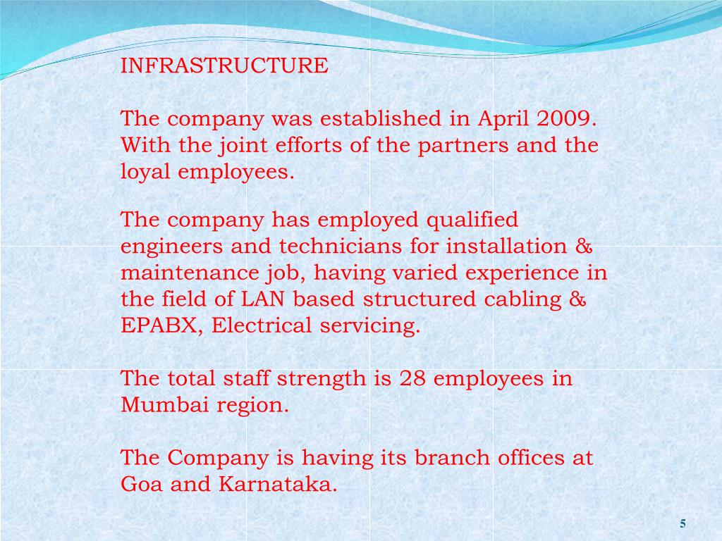 INFRASTRUCTUREThe company was established in April 2009. With the joint efforts of the partners and the loyal employees.The company has employed qualified engineers and technicians for installation & maintenance job, having varied experience in the field of LAN based structured cabling & EPABX, Electrical servicing.The total staff strength is 28 employees in Mumbai region.The Company is having its branch offices at Goa and Karnataka.