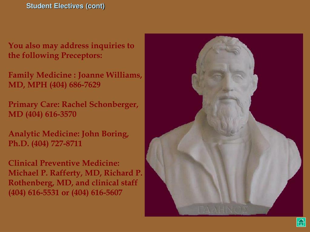 Student Electives (cont) You also may address inquiries to the following Preceptors: Family Medicine :Joanne Williams, MD, MPH (404) 686-7629 Primary Care: Rachel Schonberger, MD (404) 616-3570 Analytic Medicine: John Boring, Ph.D. (404) 727-8711 Clinical Preventive Medicine: Michael P. Rafferty, MD, Richard P. Rothenberg, MD, and clinical staff (404) 616-5531 or (404) 616-5607