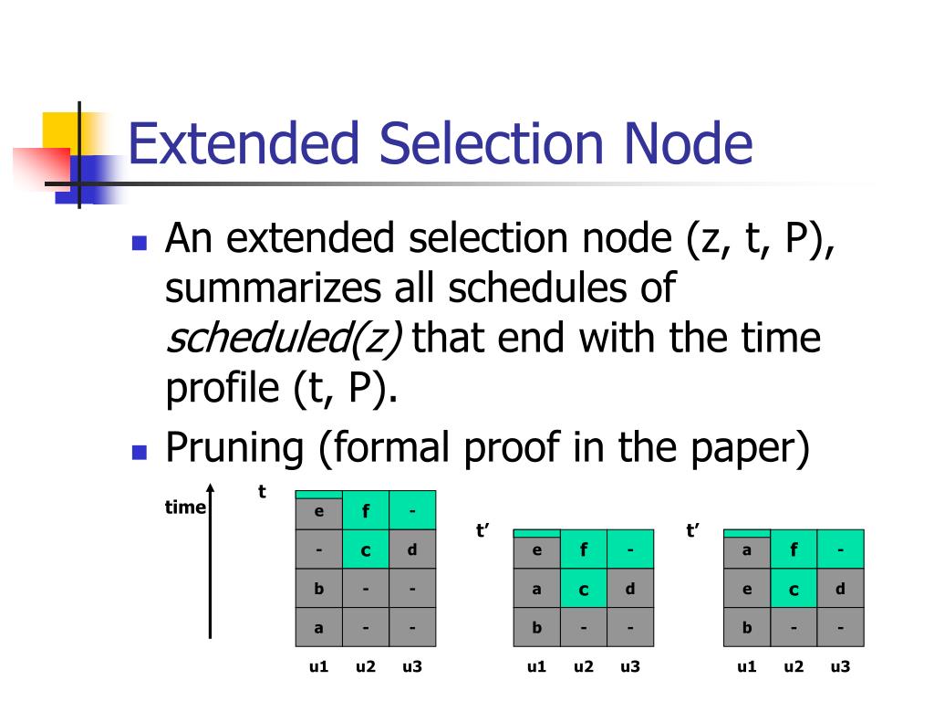 time Extended Selection Node • An extended selection node (z, t, P), summarizes all schedules of scheduled(z) that end with the time profile (t, P). • Pruning (formal proof in the paper) t e f - t’ t’ - c d e f - a f - b - - a c d e c d a - - b - - b - - u1 u2 u3 u1 u2 u3 u1 u2 u3