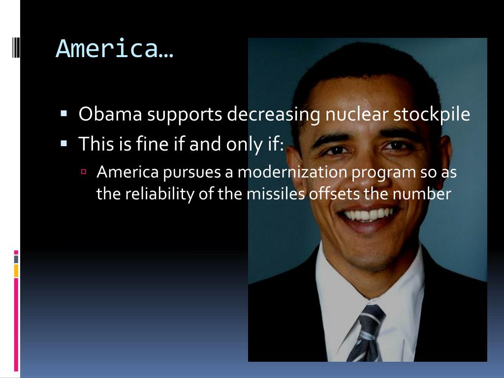 America… • Obama supports decreasing nuclear stockpile • This is fine if and only if: • America pursues a modernization program so as the reliability of the missiles offsets the number