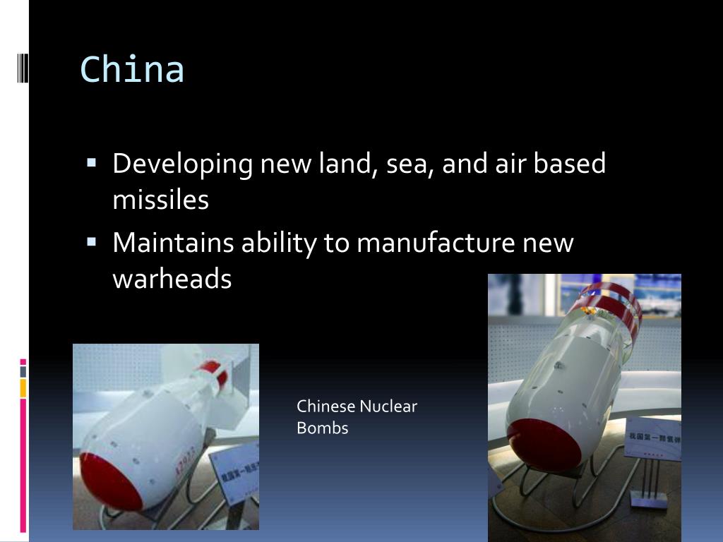 China • Developing new land, sea, and air based missiles • Maintains ability to manufacture new warheads Chinese Nuclear Bombs