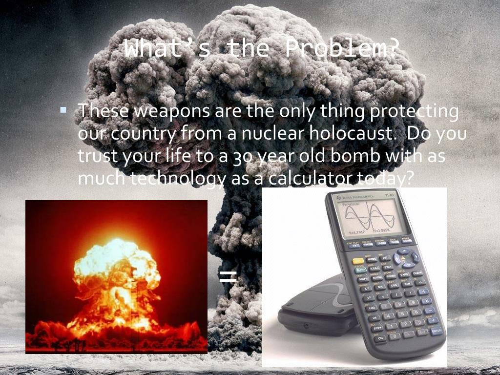What’s the Problem? • These weapons are the only thing protecting our country from a nuclear holocaust. Do you trust your life to a 30 year old bomb with as much technology as a calculator today? = =