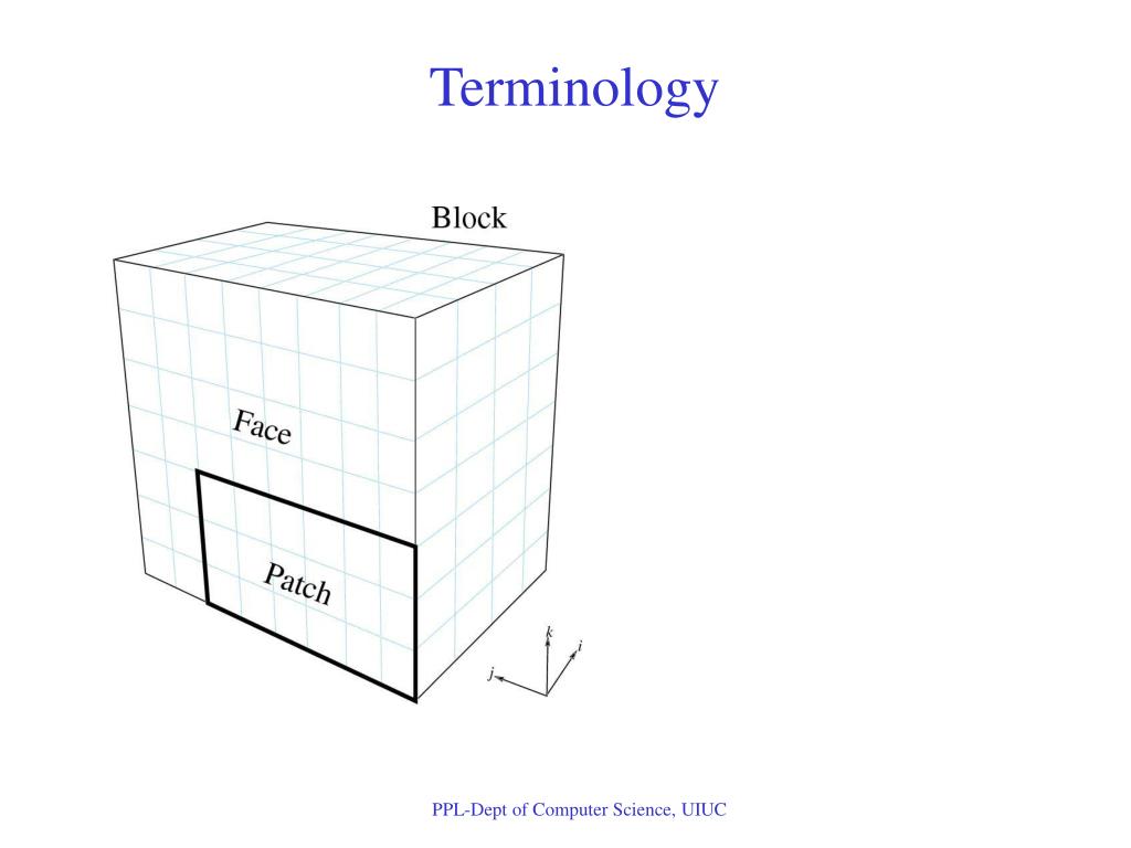 Multiblock Driver subroutine driver() implicit none include 'mblockf.h’ … call MBLK_Get_myblock(blockNo,err) call MBLK_Get_blocksize(size,err) ... call MBLK_Create_field(& &size,1, MBLK_DOUBLE,1,& &offsetof(grid(1,1,1),grid(si,sj,sk)),& &offsetof(grid(1,1,1),grid(2,1,1)),fid,err) ! Register boundary condition functions call MBLK_Register_bc(0,ghostWidth, BC_imposed, err) … Time Loop end PPL-Dept of Computer Science, UIUC