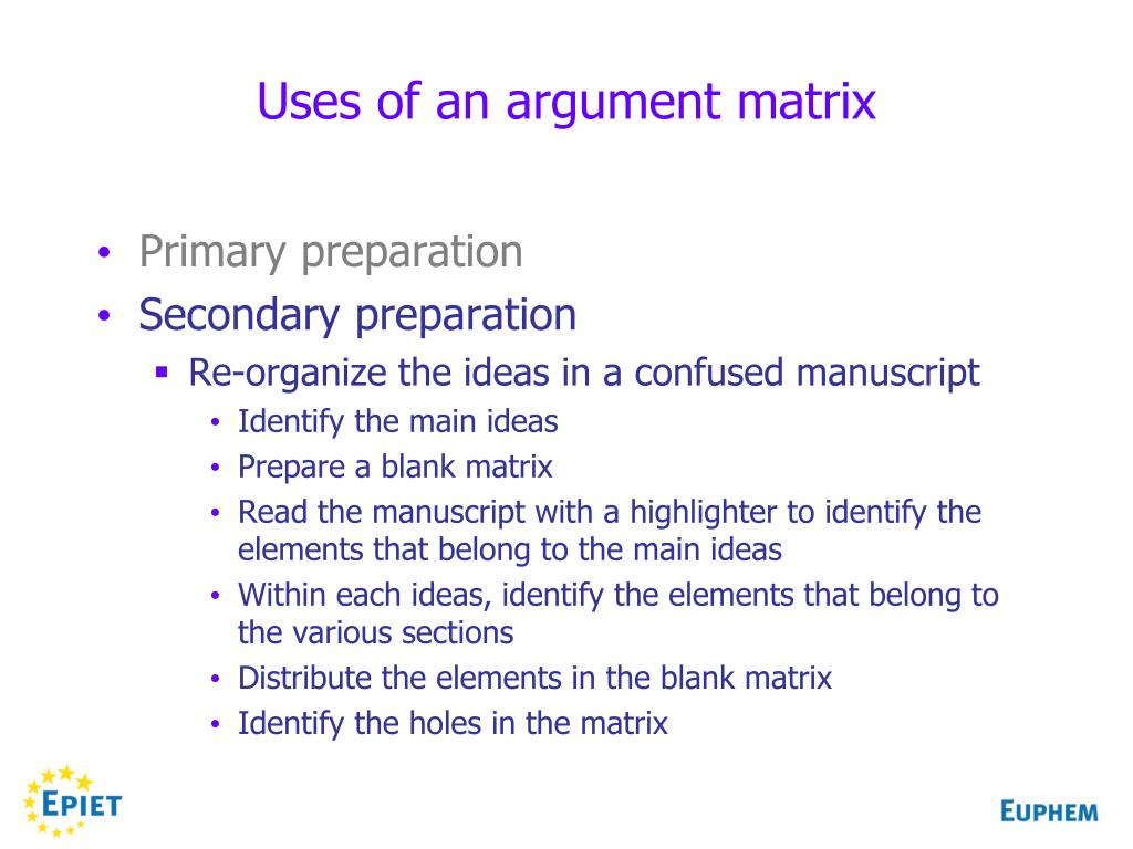 Uses of an argument matrix • Primary preparation • Secondary preparation • Re-organize the ideas in a confused manuscript • Identify the main ideas • Prepare a blank matrix • Read the manuscript with a highlighter to identify the elements that belong to the main ideas • Within each ideas, identify the elements that belong to the various sections • Distribute the elements in the blank matrix • Identify the holes in the matrix