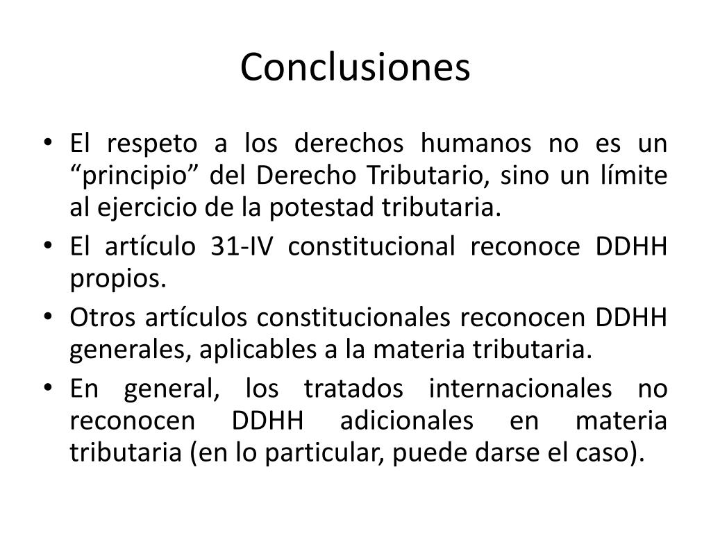 Conclusiones • El respeto a los derechos humanos no es un “principio” del Derecho Tributario, sino un límite al ejercicio de la potestad tributaria. • El artículo 31-IV constitucional reconoce DDHH propios. • Otros artículos constitucionales reconocen DDHH generales, aplicables a la materia tributaria. • En general, los tratados internacionales no reconocen DDHH adicionales en materia tributaria (en lo particular, puede darse el caso).