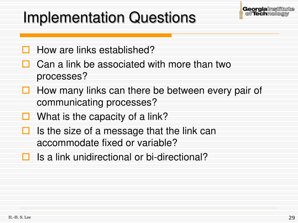 Implementation Questions • How are links established? • Can a link be associated with more than two processes? • How many links can there be between every pair of communicating processes? • What is the capacity of a link? • Is the size of a message that the link can accommodate fixed or variable? • Is a link unidirectional or bi-directional?