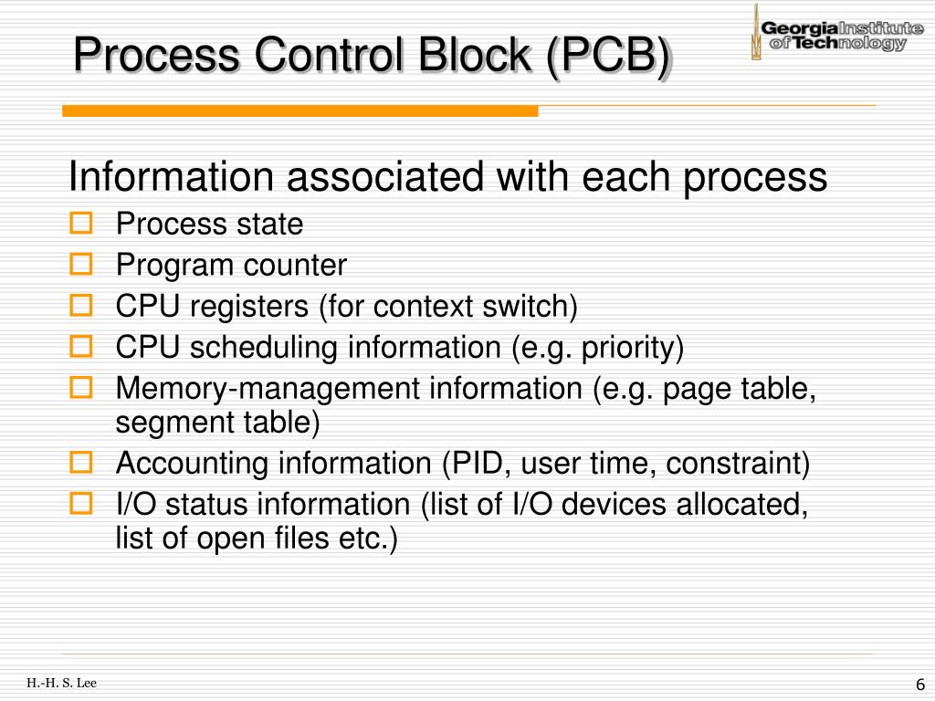 Process Control Block (PCB) Information associated with each process • Process state • Program counter • CPU registers (for context switch) • CPU scheduling information (e.g. priority) • Memory-management information (e.g. page table, segment table) • Accounting information (PID, user time, constraint) • I/O status information (list of I/O devices allocated, list of open files etc.)