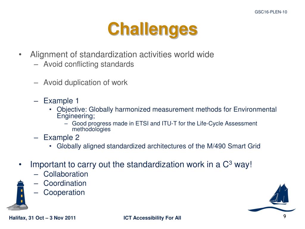 Challenges • Alignment of standardization activities world wide • Avoid conflicting standards • Avoid duplication of work • Example 1 • Objective: Globally harmonized measurement methods for Environmental Engineering; • Good progress made in ETSI and ITU-T for the Life-Cycle Assessment methodologies • Example 2 • Globally aligned standardized architectures of the M/490 Smart Grid • Important to carry out the standardization work in a C3 way! • Collaboration • Coordination • Cooperation