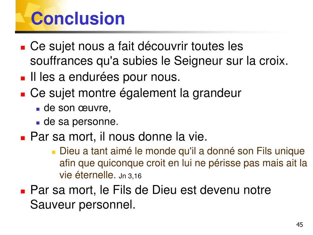 Conclusion • Ce sujet nous a fait découvrir toutes les souffrances qu'a subies le Seigneur sur la croix. • Il les a endurées pour nous. • Ce sujet montre également la grandeur • de son œuvre, • de sa personne. • Par sa mort, il nous donne la vie. • Dieu a tant aimé le monde qu'il a donné son Fils unique afin que quiconque croit en lui ne périsse pas mais ait la vie éternelle. Jn 3,16 • Par sa mort, le Fils de Dieu est devenu notre Sauveur personnel.