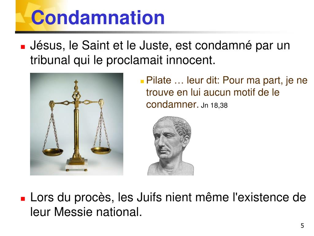 Condamnation • Jésus, le Saint et le Juste, est condamné par un tribunal qui le proclamait innocent. • Pilate … leur dit: Pour ma part, je ne trouve en lui aucun motif de le condamner.Jn 18,38 • Lors du procès, les Juifs nient même l'existence de leur Messie national.
