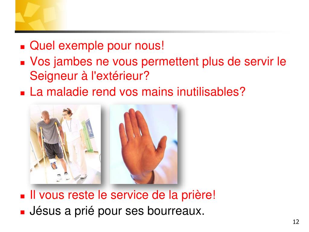 Quel exemple pour nous! • Vos jambes ne vous permettent plus de servir le Seigneur à l'extérieur? • La maladie rend vos mains inutilisables? • Il vous reste le service de la prière! • Jésus a prié pour ses bourreaux.