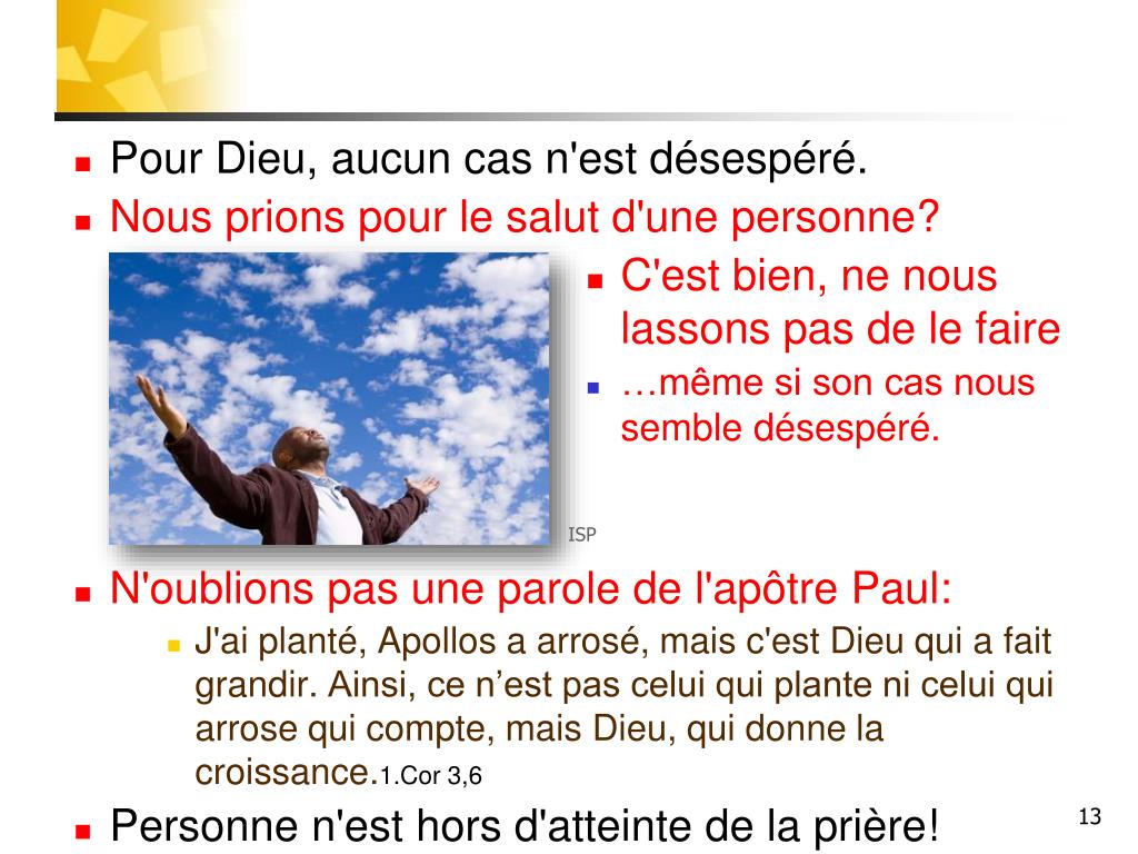 Pour Dieu, aucun cas n'est désespéré. • Nous prions pour le salut d'une personne? • C'est bien, ne nous lassons pas de le faire • …même si son cas nous semble désespéré. • N'oublions pas une parole de l'apôtre Paul: • J'ai planté, Apollos a arrosé, mais c'est Dieu qui a fait grandir. Ainsi, ce n’est pas celui qui plante ni celui qui arrose qui compte, mais Dieu, qui donne la croissance.1.Cor 3,6 • Personne n'est hors d'atteinte de la prière! ISP