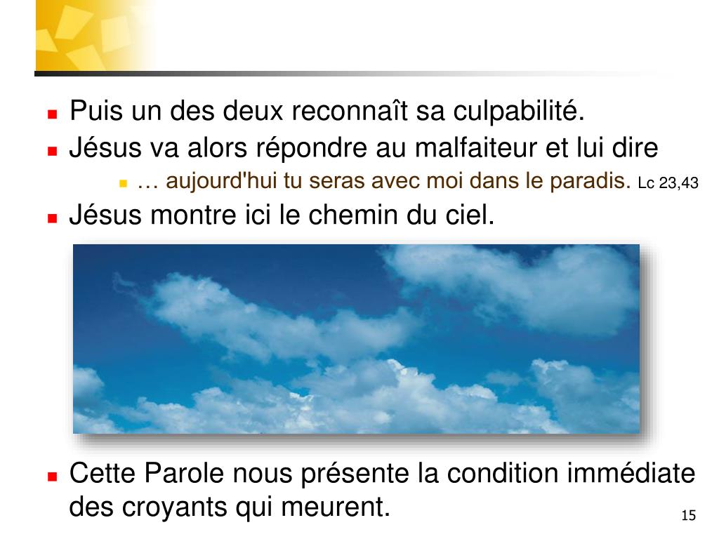 Puis un des deux reconnaît sa culpabilité. • Jésus va alors répondre au malfaiteur et lui dire • … aujourd'hui tu seras avec moi dans le paradis. Lc 23,43 • Jésus montre ici le chemin du ciel. • Cette Parole nous présente la condition immédiate des croyants qui meurent.