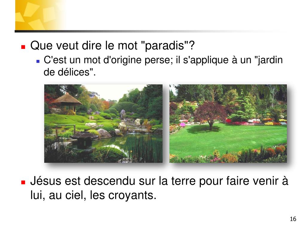 Que veut dire le mot "paradis"? • C'est un mot d'origine perse; il s'applique à un "jardin de délices". • Jésus est descendu sur la terre pour faire venir à lui, au ciel, les croyants.
