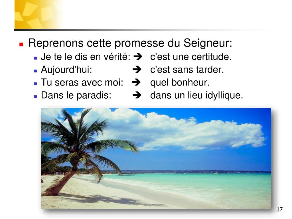 Reprenons cette promesse du Seigneur: • Je te le dis en vérité: c'est une certitude. • Aujourd'hui: c'est sans tarder. • Tu seras avec moi: quel bonheur. • Dans le paradis: dans un lieu idyllique.