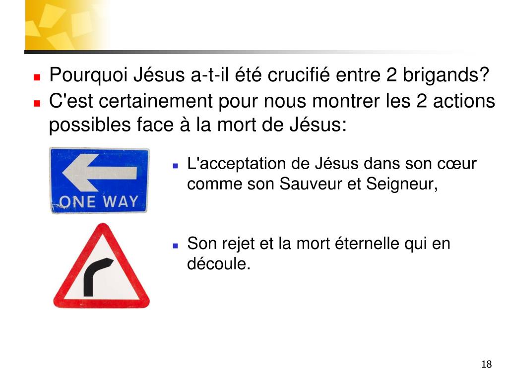 Pourquoi Jésus a-t-il été crucifié entre 2 brigands? • C'est certainement pour nous montrer les 2 actions possibles face à la mort de Jésus: • L'acceptation de Jésus dans son cœur comme son Sauveur et Seigneur, • Son rejet et la mort éternelle qui en découle.