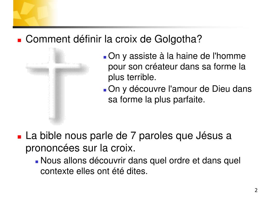 Comment définir la croix de Golgotha? On y assiste à la haine de l'homme pour son créateur dans sa forme la plus terrible. On y découvre l'amour de Dieu dans sa forme la plus parfaite. La bible nous parle de 7 paroles que Jésus a prononcées sur la croix. Nous allons découvrir dans quel ordre et dans quel contexte elles ont été dites.
