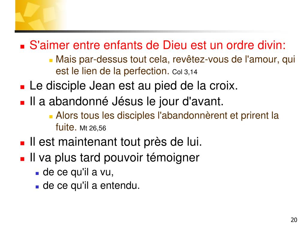 S'aimer entre enfants de Dieu est un ordre divin: • Mais par-dessus tout cela, revêtez-vous de l'amour, qui est le lien de la perfection. Col 3,14 • Le disciple Jean est au pied de la croix. • Il a abandonné Jésus le jour d'avant. • Alors tous les disciples l'abandonnèrent et prirent la fuite. Mt 26,56 • Il est maintenant tout près de lui. • Il va plus tard pouvoir témoigner • de ce qu'il a vu, • de ce qu'il a entendu.