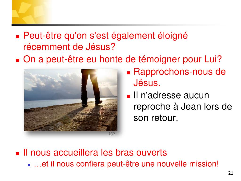 Peut-être qu'on s'est également éloigné récemment de Jésus? • On a peut-être eu honte de témoigner pour Lui? • Rapprochons-nous de Jésus. • Il n'adresse aucun reproche à Jean lors de son retour. • Il nous accueillera les bras ouverts • …et il nous confiera peut-être une nouvelle mission! ISP