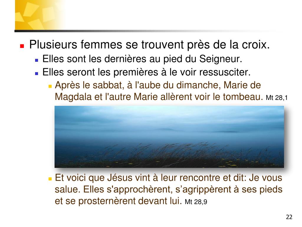 Plusieurs femmes se trouvent près de la croix. • Elles sont les dernières au pied du Seigneur. • Elles seront les premières à le voir ressusciter. • Après le sabbat, à l'aube du dimanche, Marie de Magdala et l'autre Marie allèrent voir le tombeau. Mt 28,1 • Et voici que Jésus vint à leur rencontre et dit: Je vous salue. Elles s'approchèrent, s’agrippèrent à ses pieds et se prosternèrent devant lui. Mt 28,9