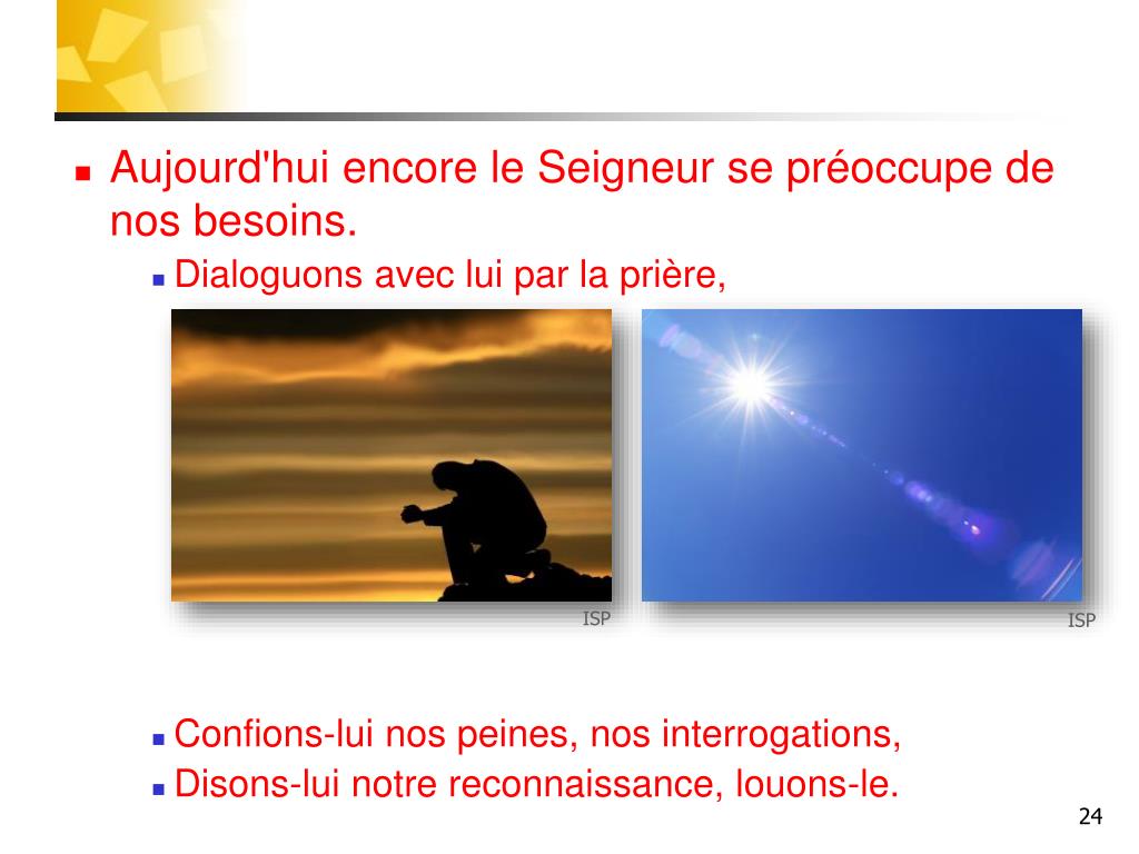 Aujourd'hui encore le Seigneur se préoccupe de nos besoins. • Dialoguons avec lui par la prière, • Confions-lui nos peines, nos interrogations, • Disons-lui notre reconnaissance, louons-le. ISP ISP