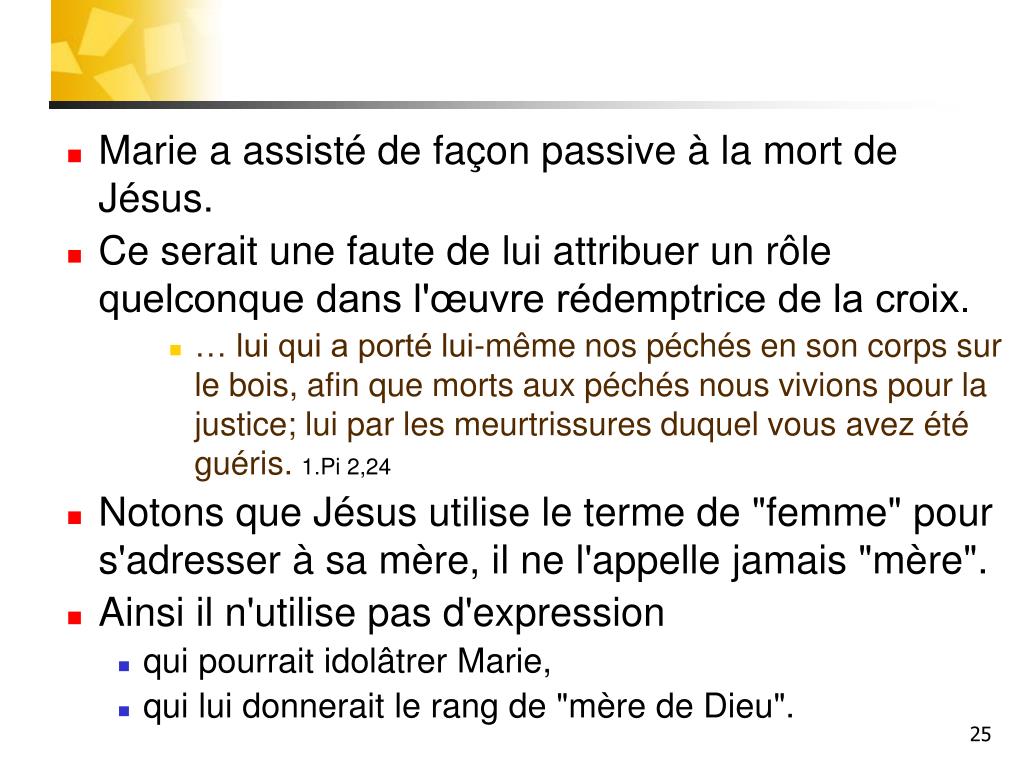 Marie a assisté de façon passive à la mort de Jésus. • Ce serait une faute de lui attribuer un rôle quelconque dans l'œuvre rédemptrice de la croix. • … lui qui a porté lui-même nos péchés en son corps sur le bois, afin que morts aux péchés nous vivions pour la justice; lui par les meurtrissures duquel vous avez été guéris. 1.Pi 2,24 • Notons que Jésus utilise le terme de "femme" pour s'adresser à sa mère, il ne l'appelle jamais "mère". • Ainsi il n'utilise pas d'expression • qui pourrait idolâtrer Marie, • qui lui donnerait le rang de "mère de Dieu".