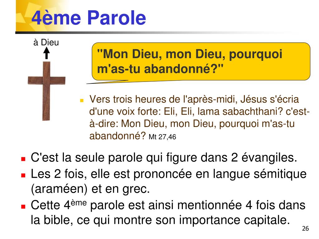 4ème Parole à Dieu • Vers trois heures de l'après-midi, Jésus s'écria d'une voix forte: Eli, Eli, lama sabachthani? c'est-à-dire: Mon Dieu, mon Dieu, pourquoi m'as-tu abandonné? Mt 27,46 • C'est la seule parole qui figure dans 2 évangiles. • Les 2 fois, elle est prononcée en langue sémitique (araméen) et en grec. • Cette 4ème parole est ainsi mentionnée 4 fois dans la bible, ce qui montre son importance capitale. "Mon Dieu, mon Dieu, pourquoi m'as-tu abandonné?"