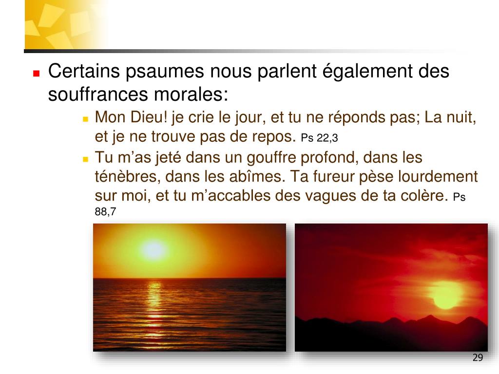 Certains psaumes nous parlent également des souffrances morales: • Mon Dieu! je crie le jour, et tu ne réponds pas; La nuit, et je ne trouve pas de repos. Ps 22,3 • Tu m’as jeté dans un gouffre profond, dans les ténèbres, dans les abîmes. Ta fureur pèse lourdement sur moi, et tu m’accables des vagues de ta colère.Ps 88,7