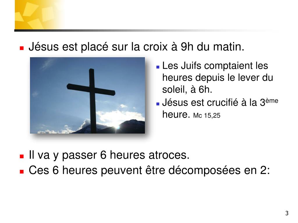 Jésus est placé sur la croix à 9h du matin. • Les Juifs comptaient les heures depuis le lever du soleil, à 6h. • Jésus est crucifié à la 3ème heure. Mc 15,25 • Il va y passer 6 heures atroces. • Ces 6 heures peuvent être décomposées en 2: