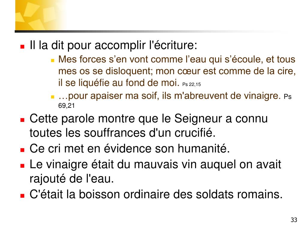 Il la dit pour accomplir l'écriture: • Mes forces s’en vont comme l’eau qui s’écoule, et tous mes os se disloquent; mon cœur est comme de la cire, il se liquéfie au fond de moi. Ps 22,15 • …pour apaiser ma soif, ils m'abreuvent de vinaigre. Ps 69,21 • Cette parole montre que le Seigneur a connu toutes les souffrances d'un crucifié. • Ce cri met en évidence son humanité. • Le vinaigre était du mauvais vin auquel on avait rajouté de l'eau. • C'était la boisson ordinaire des soldats romains.