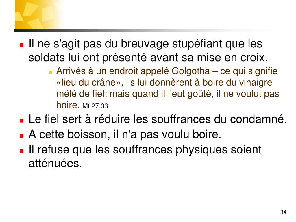Il ne s'agit pas du breuvage stupéfiant que les soldats lui ont présenté avant sa mise en croix. • Arrivés à un endroit appelé Golgotha – ce qui signifie «lieu du crâne», ils lui donnèrent à boire du vinaigre mêlé de fiel; mais quand il l'eut goûté, il ne voulut pas boire. Mt 27,33 • Le fiel sert à réduire les souffrances du condamné. • A cette boisson, il n'a pas voulu boire. • Il refuse que les souffrances physiques soient atténuées.