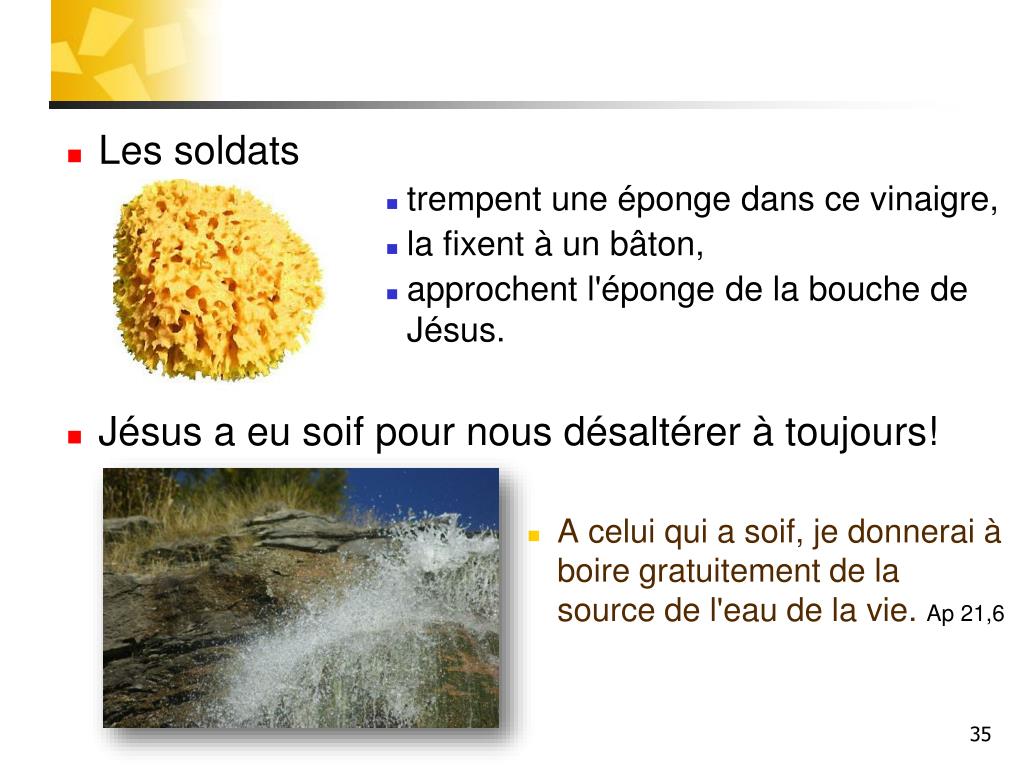Les soldats • trempent une éponge dans ce vinaigre, • la fixent à un bâton, • approchent l'éponge de la bouche de Jésus. • Jésus a eu soif pour nous désaltérer à toujours! • A celui qui a soif, je donnerai à boire gratuitement de la source de l'eau de la vie. Ap 21,6