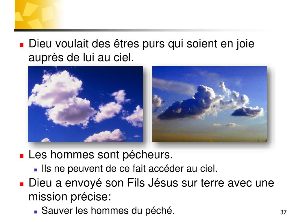 Dieu voulait des êtres purs qui soient en joie auprès de lui au ciel. • Les hommes sont pécheurs. • Ils ne peuvent de ce fait accéder au ciel. • Dieu a envoyé son Fils Jésus sur terre avec une mission précise: • Sauver les hommes du péché.