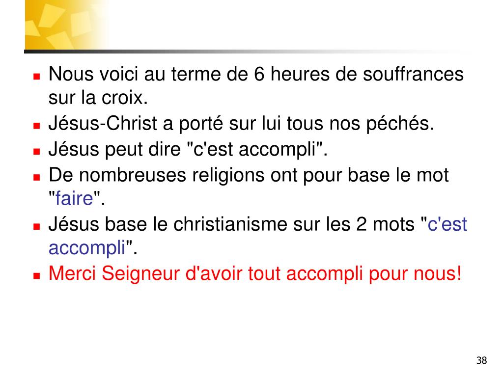 Nous voici au terme de 6 heures de souffrances sur la croix. • Jésus-Christ a porté sur lui tous nos péchés. • Jésus peut dire "c'est accompli". • De nombreuses religions ont pour base le mot "faire". • Jésus base le christianisme sur les 2 mots "c'est accompli". • Merci Seigneur d'avoir tout accompli pour nous!