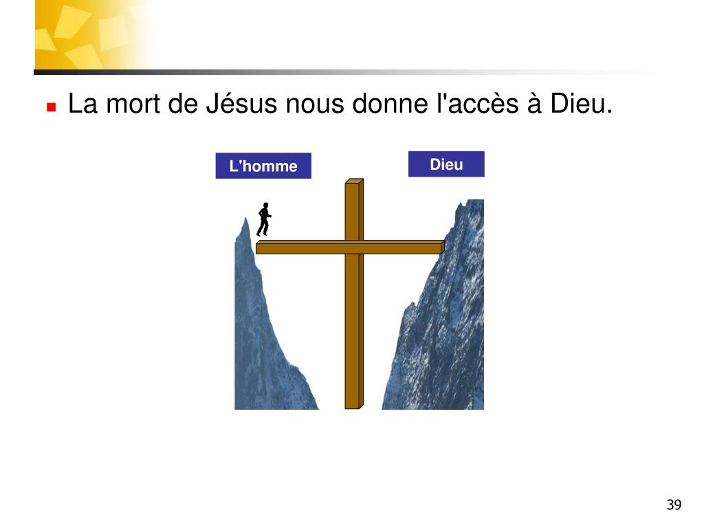 La mort de Jésus nous donne l'accès à Dieu. Dieu L'homme