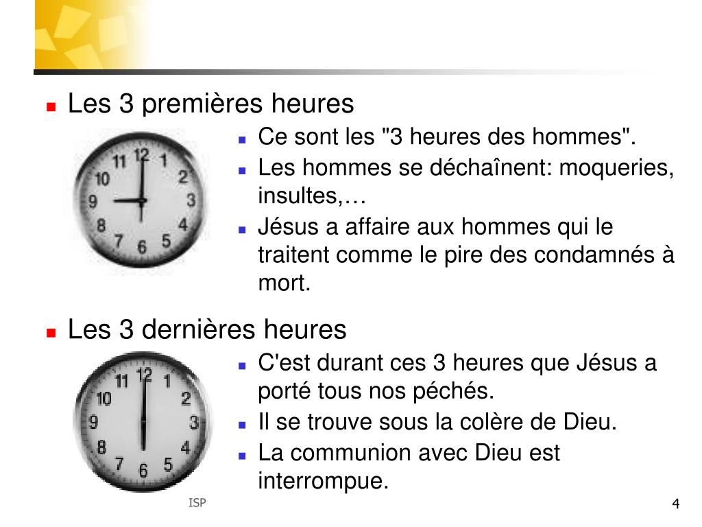 Les 3 premières heures • Ce sont les "3 heures des hommes". • Les hommes se déchaînent: moqueries, insultes,… • Jésus a affaire aux hommes qui le traitent comme le pire des condamnés à mort. • Les 3 dernières heures • C'est durant ces 3 heures que Jésus a porté tous nos péchés. • Il se trouve sous la colère de Dieu. • La communion avec Dieu est interrompue. ISP