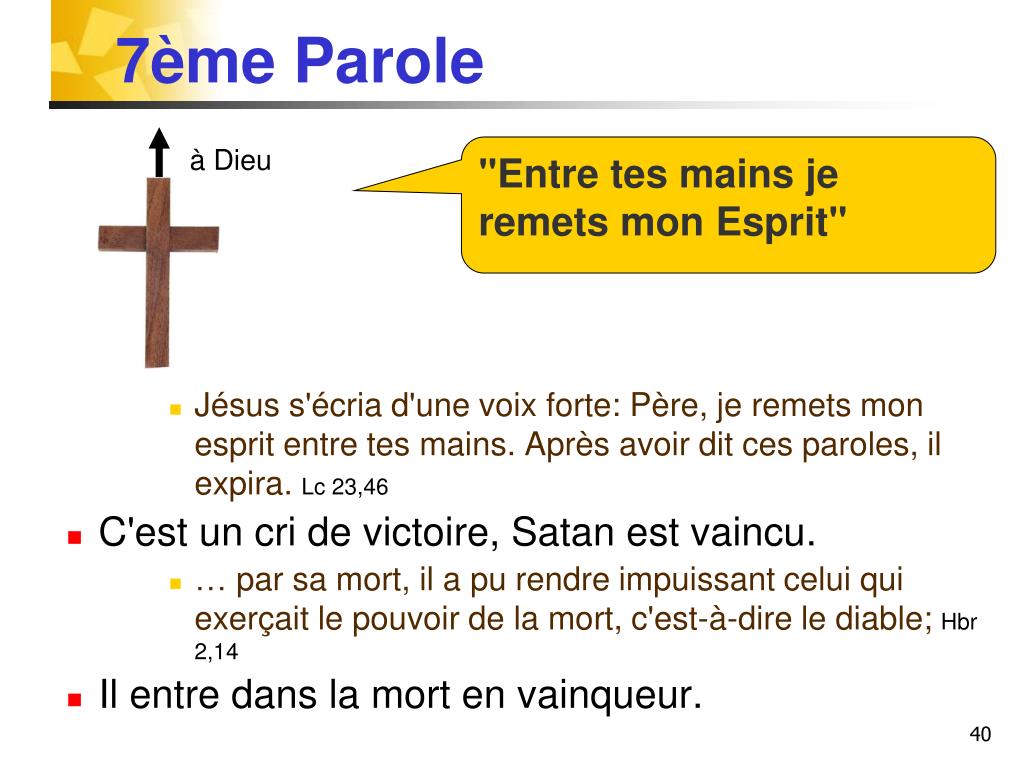 7ème Parole • Jésus s'écria d'une voix forte: Père, je remets mon esprit entre tes mains. Après avoir dit ces paroles, il expira. Lc 23,46 • C'est un cri de victoire, Satan est vaincu. • … par sa mort, il a pu rendre impuissant celui qui exerçait le pouvoir de la mort, c'est-à-dire le diable; Hbr 2,14 • Il entre dans la mort en vainqueur. à Dieu "Entre tes mains je remets mon Esprit"